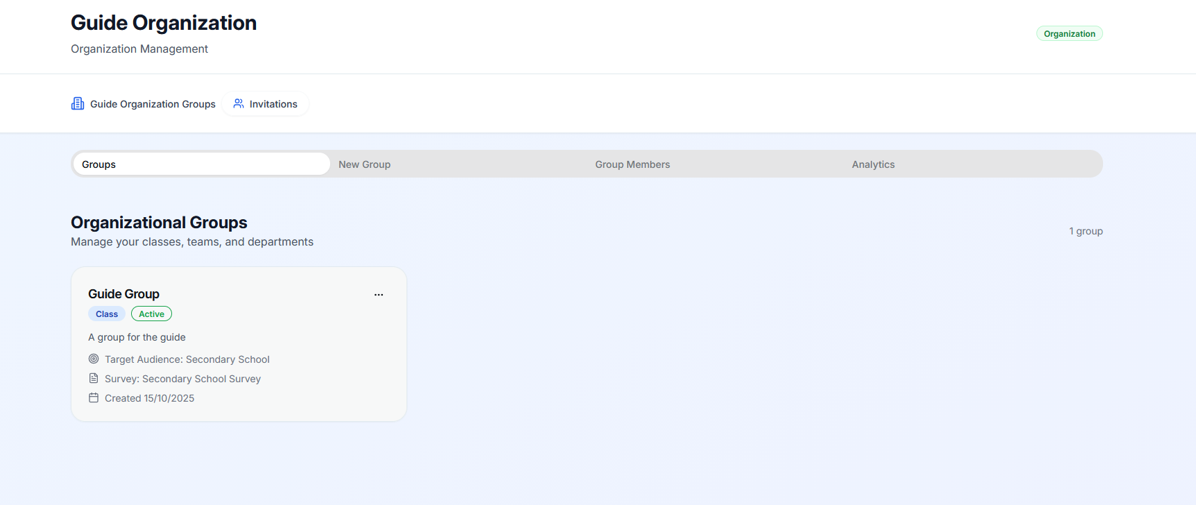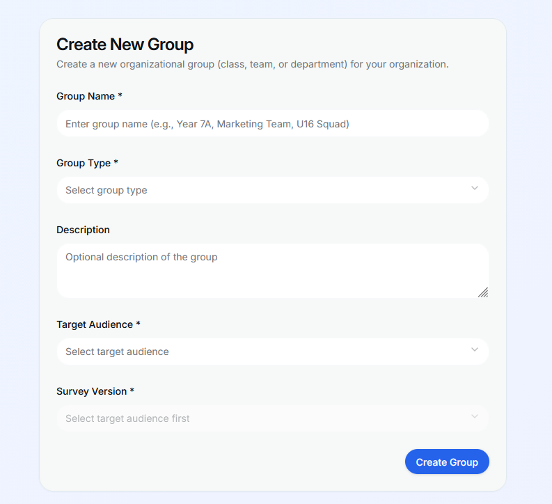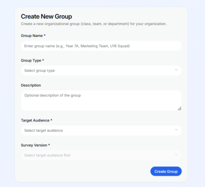 After having done so, you will see the “Create new group” card, fill the form with the relevant information, selecting the target audience (one target audience per group) and selecting the survey you want associated with that group, finally click the blue button “Create Group”