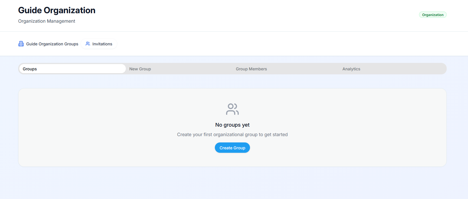 After having created your organization, and accessing it, you will be redirected to the organization dashboard with a list of your groups. If none is created, you will see a call-out to create a new group, click the blue “Create Group” button