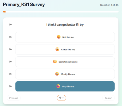 At every point, unless you’re on the first question, you are able to go back (by pressing “Previous”) or restart the whole process (by pressing “Restart”); These buttons are located at the bottom of the survey.