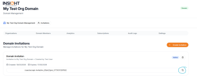 Having clicked the “Create invitation” a list of invites will appear, where you can copy and send that link to the person you wish to invite to the domain: