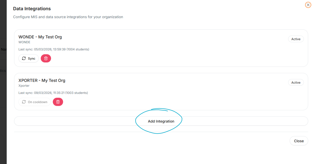 As an organization admin, or domain admin after reaching the organization dashboard, you can access and manage your MIS Integrations by accessing the “Integrations” screen through your organization